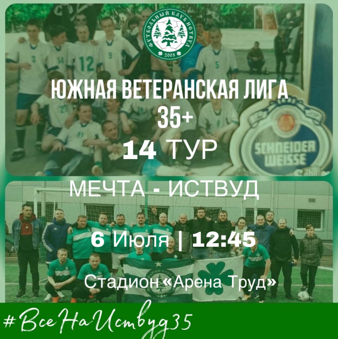 В 14 туре чемпионата 35+ "Иствуд" одержал победу над командой "Мечта" 3:1. Голами в составе нашей команды отметились Евгений Коптев и Константин Ермаков, еще один гол соперник отправил в свои ворота.