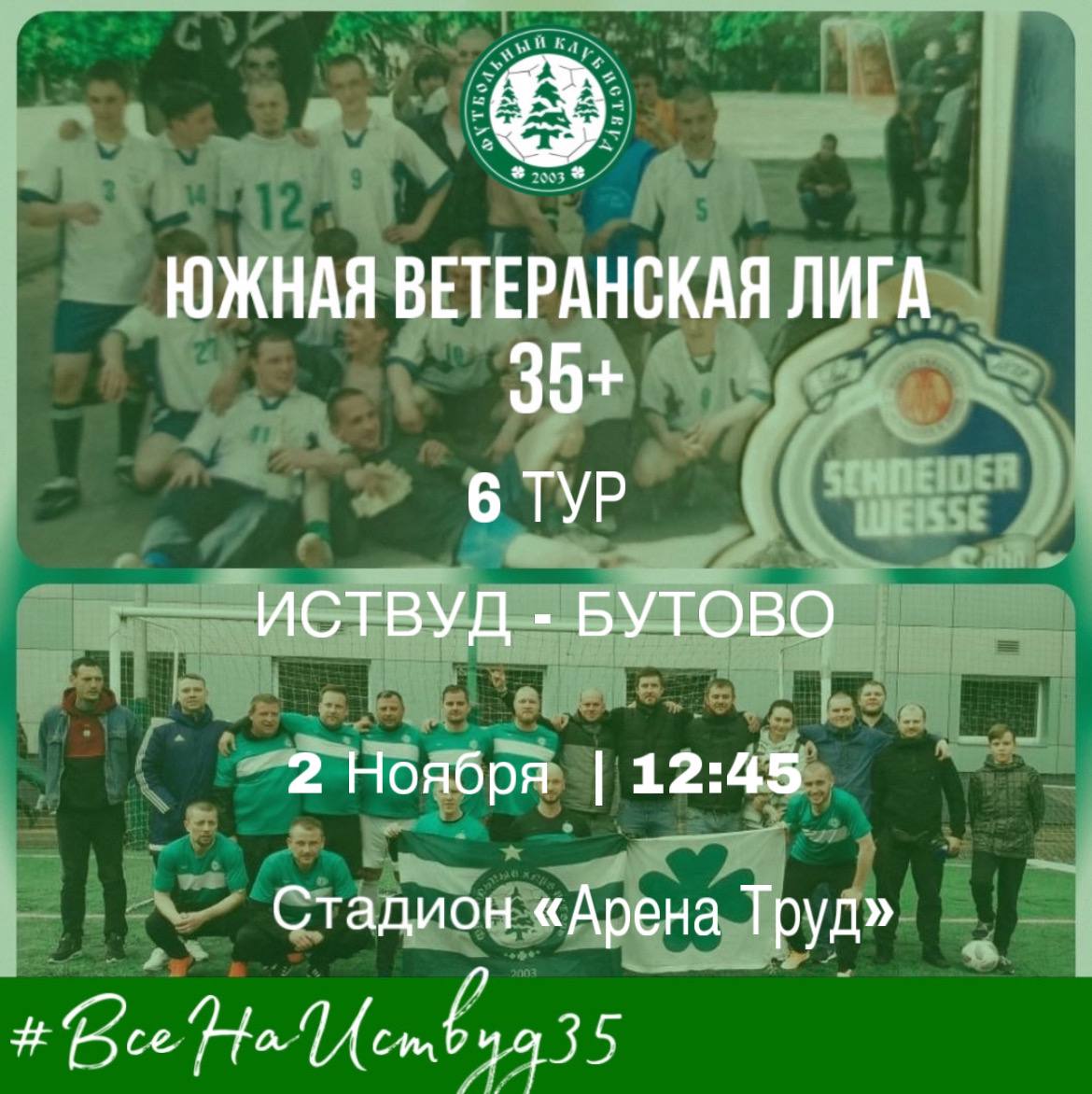 В 6 туре чемпионата 35+ Южной ветеранской лиги "Иствуд" одержал волевую победу над командой "Бутово" 2:1. Голы забили Евгений Коптев и Андрей Репин.